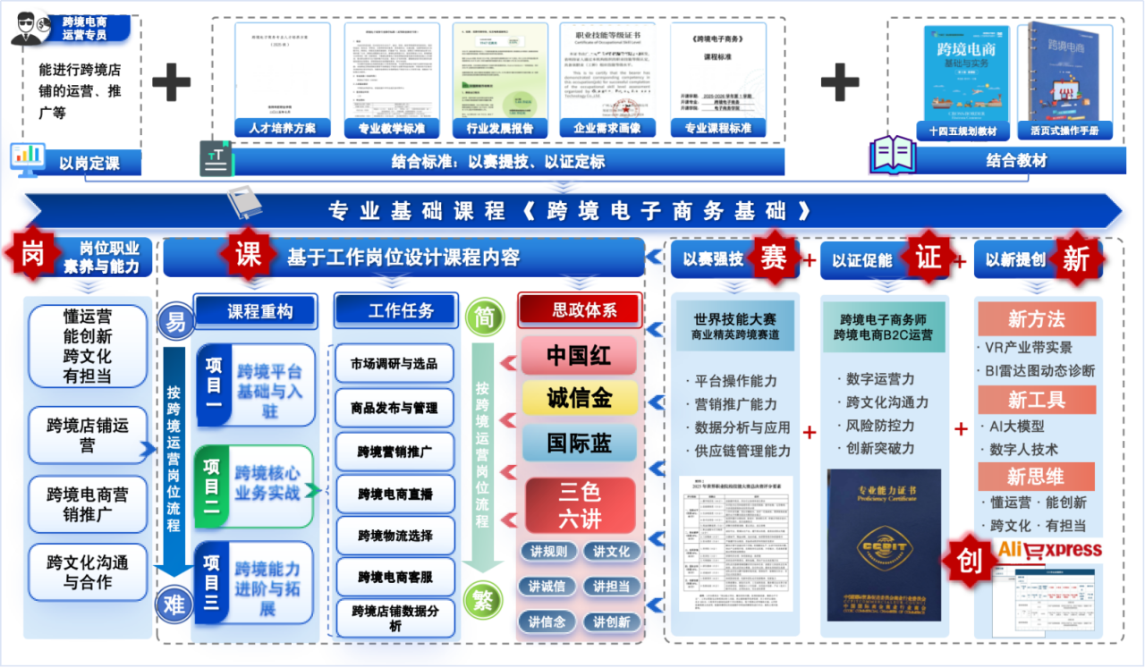 针对《跨境电子商务基础》原课程“重理论、轻实操,内容滞后于平台迭代”的问题,本次改革聚焦企业反馈的两个关键短板,也就是跨境直播不会做和新兴平台不了解,进行了三项针对性改进。重构逻辑可以概括为以岗定课、以赛提技、以证定标,目标是让学生懂运营、能创新、跨文化、有担当。