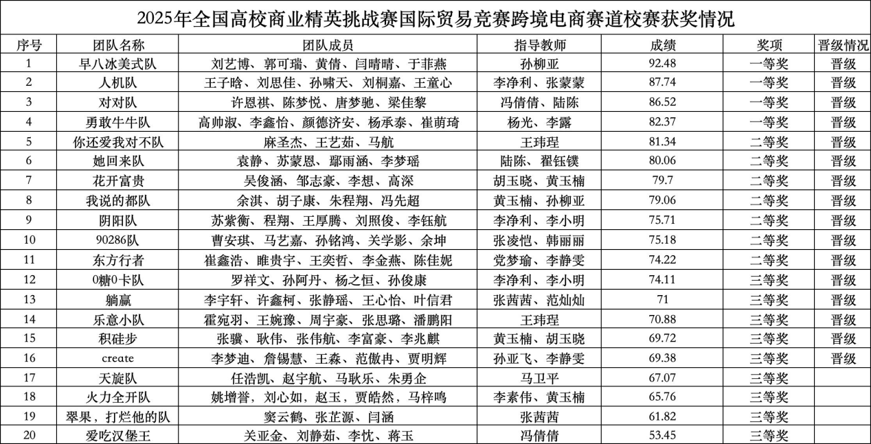2025年9月19日,由洛阳科技职业学院电子商务学院承办的2025年全国商业精英挑战赛跨境电商赛道校赛落下帷幕。本次校赛在匠心楼212教室举行,经过选手们的激烈角逐,根据各参赛团队成绩排名,共有16支队伍进入省赛,现对结果进行公示。