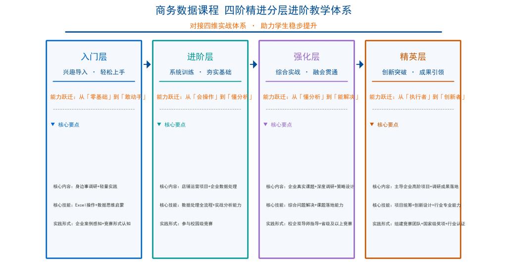 入门层——兴趣导入,轻松上手:以“身边事调研”切入,开展轻量实践,学习分析工具与数据思维,初步感知企业案例与竞赛形式,实现从“零基础”到“敢动手”。