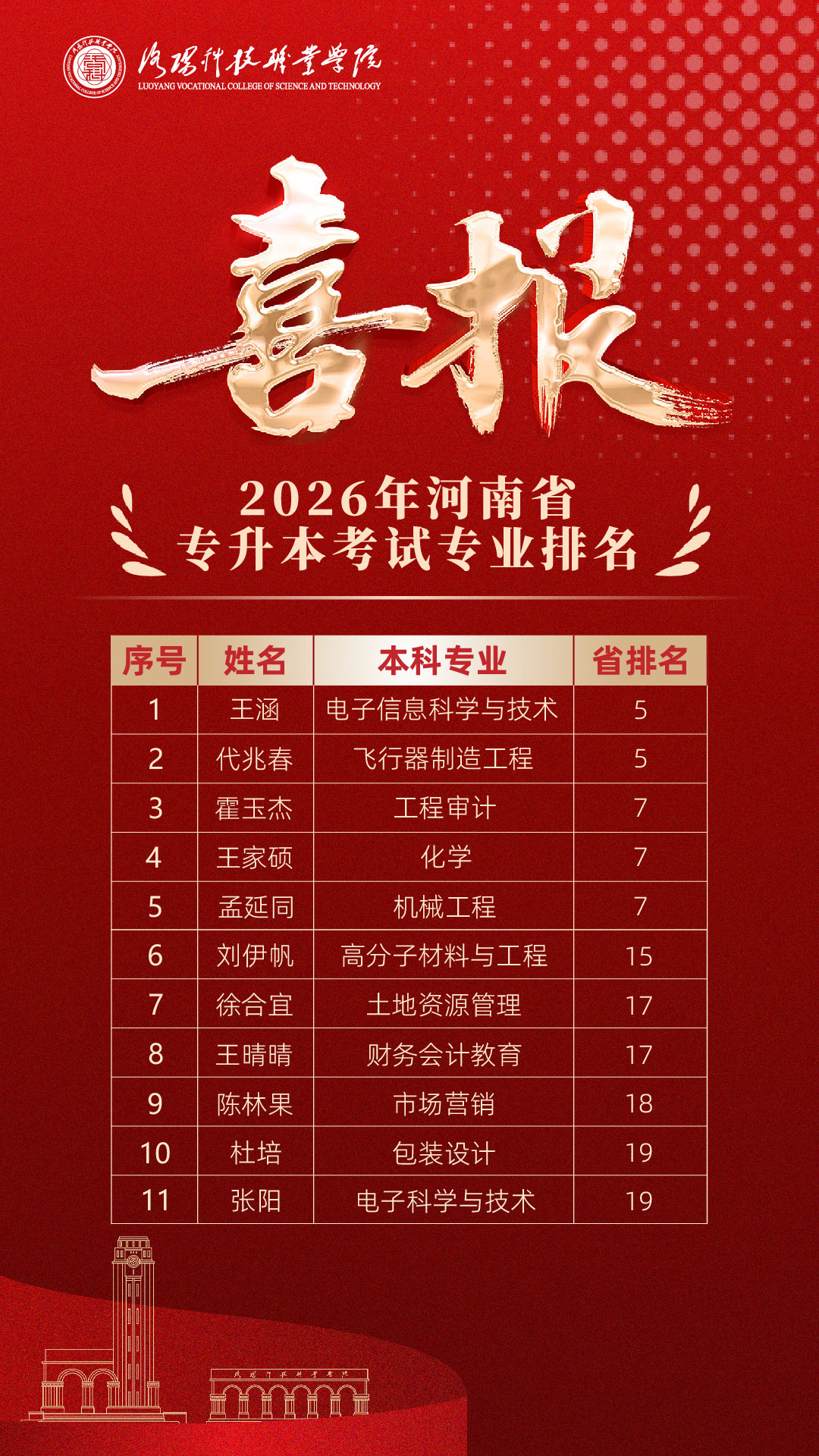 近年来,洛科在专升本赛道上屡创奇迹,形成了强劲的“头部效应”。继往年的辉煌之后,2026年的成绩单依然硬核:王涵和代兆春同学分别在电子信息科学与技术专业和飞行器制造工程专业斩获全省第五;霍玉杰、王家硕、孟延同同学分别在工程审计、化学和机械工程专业斩获全省第七。