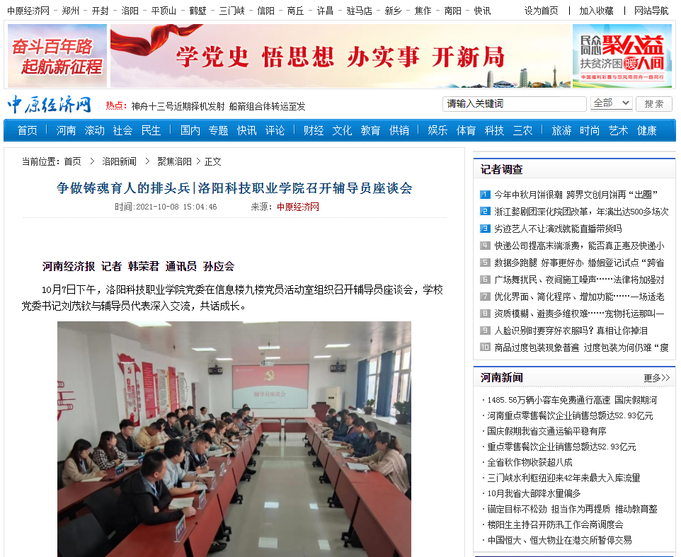 争做铸魂育人的排头兵,10月7日,洛阳科技职业学院党委组织召开辅导员座谈会,学校党委书记刘茂钦与辅导员代表深入交流,共话成长;相关信息被多家媒体报道。