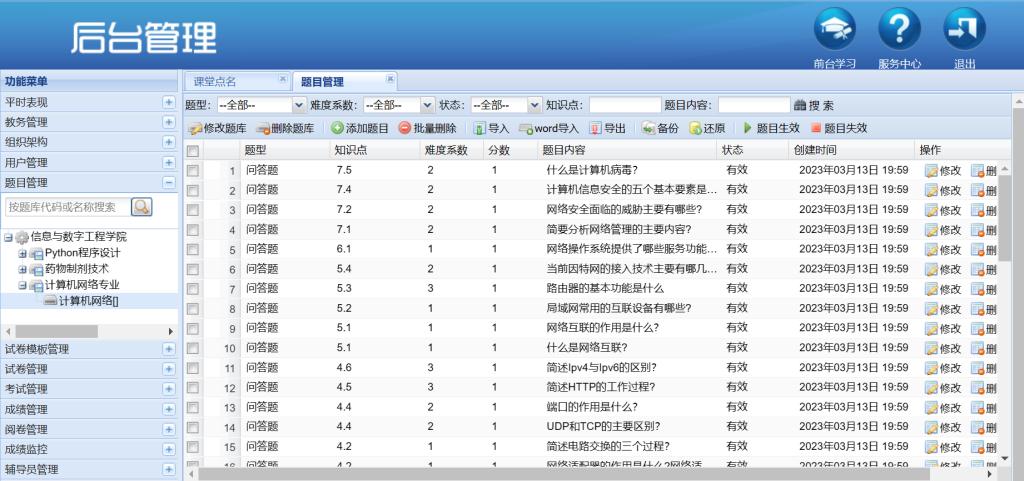 根据学校试题库建设实施方案中的规定,试题库的建设势在必行,每位老师应根据课程性质建立相应的试题库。各位老师根据课程类型不同,按照试题库建设方案要求梳理相关课程的试题、考试大纲、课程标准、考点要素表等相关内容,为下一次试题库的建设申报工作做好前期准备。