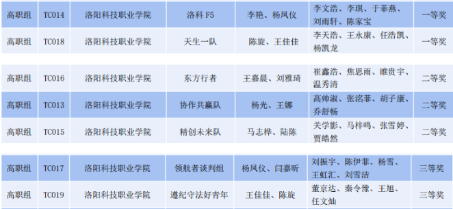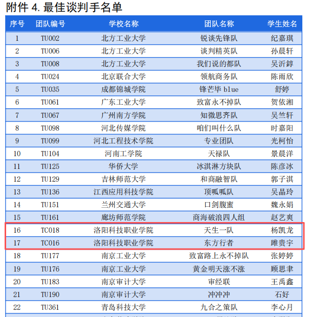在高职组比拼中,洛科学子以昂扬的姿态突破重围,交出了一份亮眼的成绩单:共获国家级奖项7项(其中一等奖2项、二等奖3项、三等奖2项)。个人奖项方面,洛科学子同样大放异彩。TC018 “天生一队” 队的杨凯龙同学、TC016 “东方行者” 队的雎贵宇同学,凭借敏锐的思维、清晰的逻辑表达和出色的应变能力,在激烈的个人比拼中脱颖而出,荣获“最佳谈判手”称号,成为赛场上耀眼的新星。