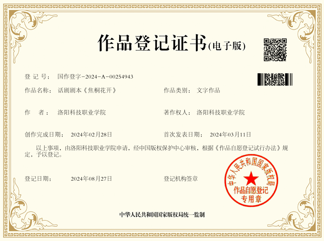 洛阳科技职业学院焦裕禄话剧《焦桐花开》剧本专利