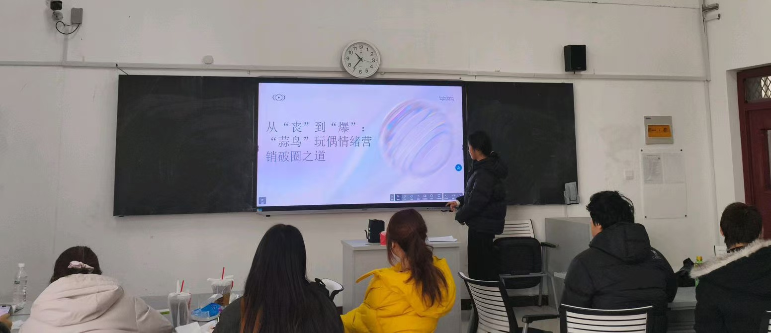 专业特色鲜明的主题设计,让小小的讲台成为学子展现专业视野的舞台。24级同学王方园聚焦市场前沿,深入解读“蒜鸟”玩偶凭借情绪营销破圈的案例,将社会经济现象与课程所学进行融合,体现了理论知识在实际生活的运用。