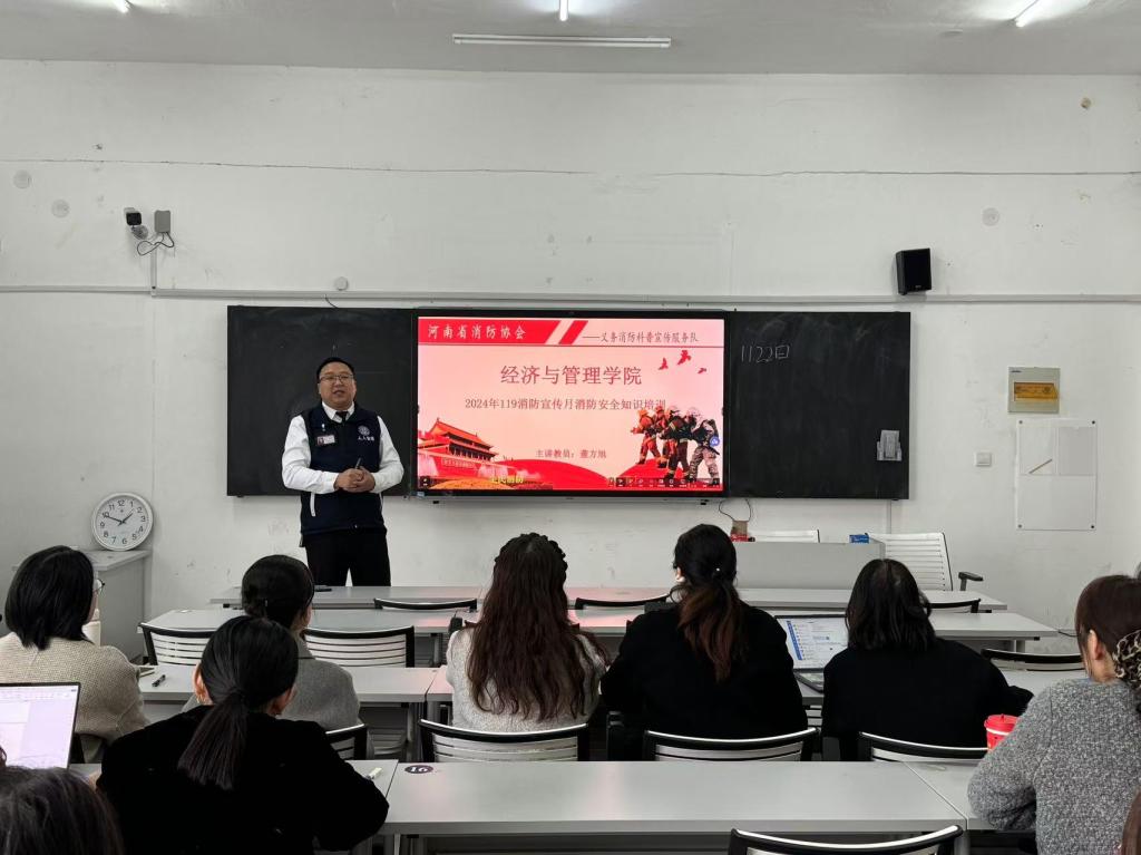 为深入学习贯彻党的二十届三中全会精神和习近平总书记关于安全生产重要论述精神,进一步提升学院师生的消防安全意识,增强应对突发火灾事件的自救互救能力,经济与管理学院于2024年11月22日下午,由河南省消防协会义务消防科普宣传服务队董方旭教员,为全体教职工进行消防安全培训,经济与管理学院全体教师参加会议。