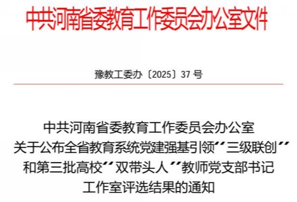 近日,中共河南省委教育工作委员会办公室发布《关于公布全省教育系统党建强基引领“三级联创”和第三批高校“双带头人”教师党支部书记工作室评选结果的通知》,经评定工作领导小组研究审议、结果公示等环节,洛...