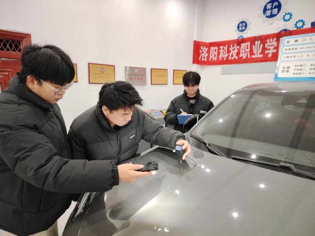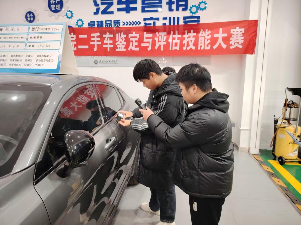 在新能源汽车学院汽车美容车间的日光灯下,一件件汽车翼子板、门板等正安静地停放在检测工位上。学生们手持专业仪器,屏息凝神——有人操纵漆膜测厚仪在翼子板关键点间反复测量,有人则手持捕纹灯在翼子板上划过一道道精准的轨迹。这里正在进行的新能源汽车工程学院“二手车鉴定与评估”赛项的备赛训练,今年的焦点格外明确:车辆的周正度检查与漆面状况评估。在这看似基础却至关重要的技能磨砺背后,一套深入实践的“以学生为中心”教学理念,正驱动着学习方式发生根本性变革。