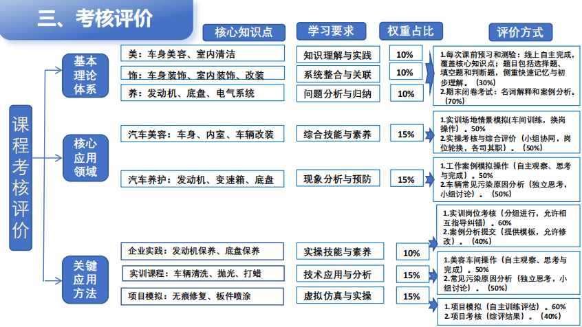 本次改革的核心方向为成果导向的能力培养,精准对接汽车美容、装饰、养护等一线岗位需求: