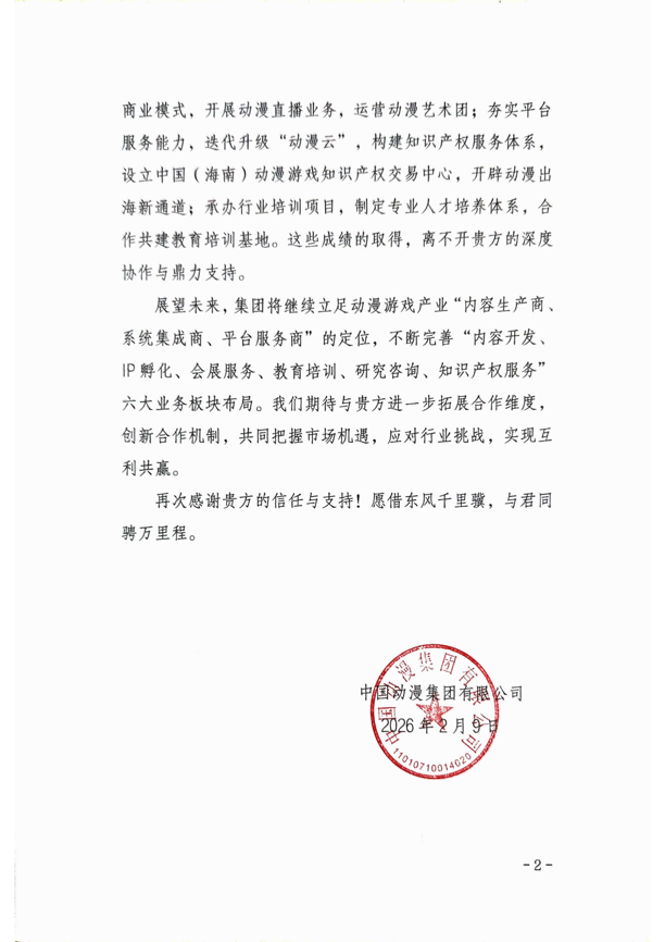 感谢信末尾,中国动漫集团以“愿借东风千里骥,与君同骋万里程”表达对未来合作的期许。双方目前在内容开发、IP孵化、会展服务、教育培训、研究咨询、知识产权服务六大板块已形成战略协同。立足新起点,洛阳科技职业学院将继续深化与中国动漫集团的战略合作,以更高质量的产教融合成果服务文化产业发展,为讲好中国故事、建设文化强国贡献职教力量。