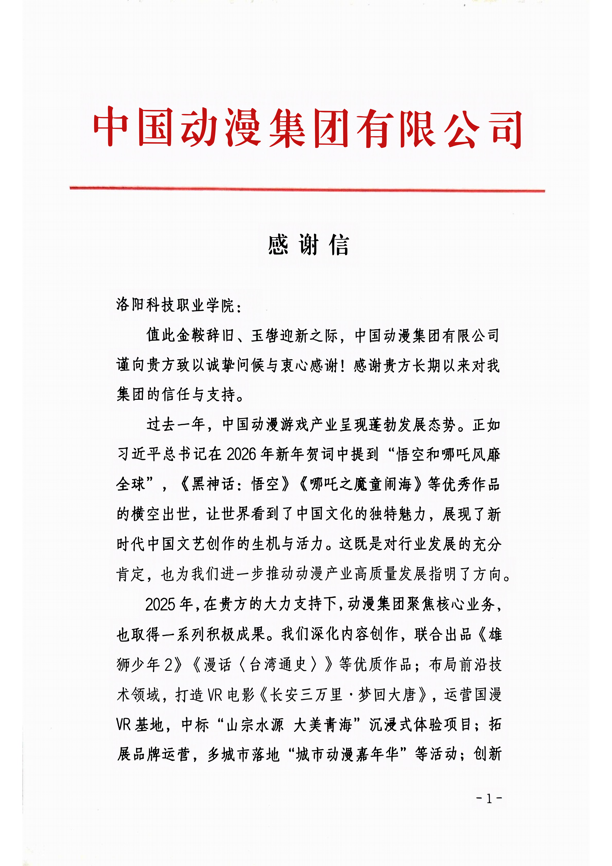 近日,一封来自中国动漫集团有限公司的感谢信送达洛阳科技职业学院。作为国家级动漫领军企业,中国动漫集团在信中对洛阳科技职业学院艺术与设计学院长期以来的支持表示感谢,并对双方过去一年在动漫游戏产业领域的合作成果给予肯定。